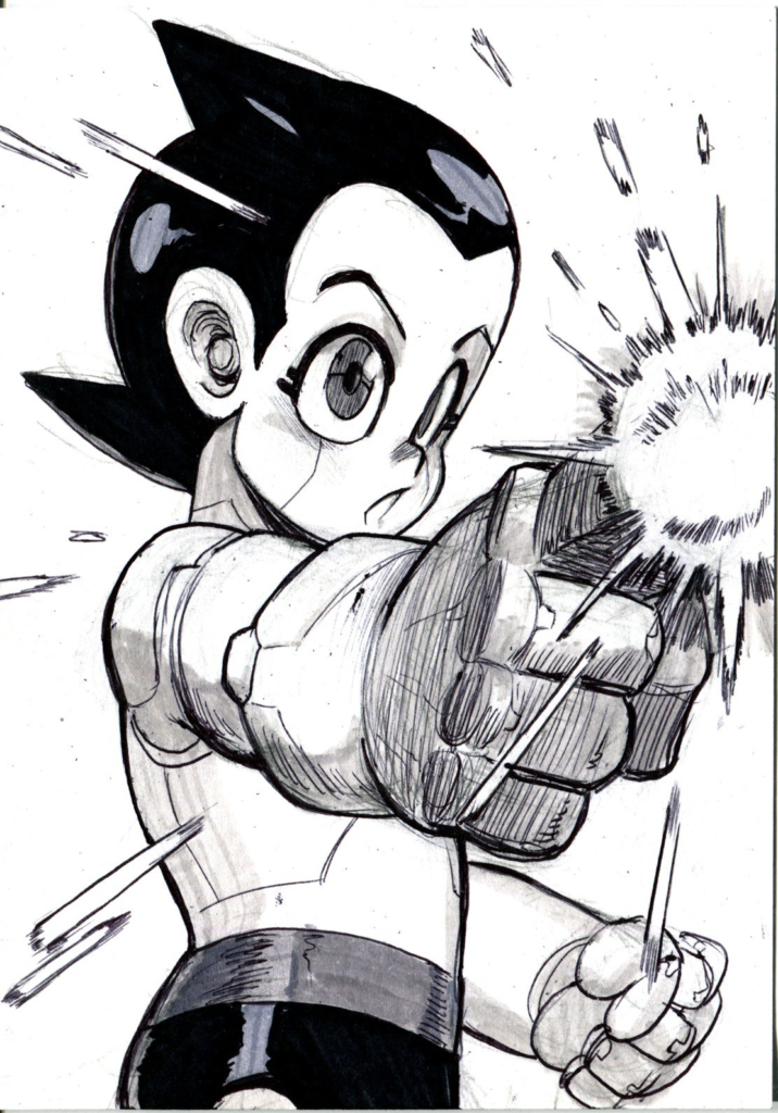 Tutto comincia dalla storiella Atomu Taishi di un Osamu Tezuka agli inizi della sua carriera da nientepopodimeno che Dio. Atomu/Atom è un robot ambasciatore (Taishi) che dirime una guerra interplanetaria. Non sforzarti di capirlo, devi solo immaginarlo, parola di Tim Burton. E quel bambino meccanico, quel Pinocchio dell’era atomica non per frasi fatte, comincia appena un avventura filosofica durata metà secolo, passata per l’incontro con Walt Disney ispiratore degli occhioni di ogni manga da qui fino alla fine del Giappone, per il (comunque discutibile) film della Aardman, fino all’istituzione del Tezuka Award per il miglior manga e i più svariati omaggi moderni, nell’ordine più succinto Pluto di Naoki Urasawa, Kaiba di Masaaki Yuasa e Team Phoenix di Kenny Ruiz. Come nelle antiche fiabe popolate di bambini perduti, orchi e matrigne, nella maggior parte delle sue avventure Atom è costretto ad allontanarsi da casa per affrontare da solo un problema il più delle volte incarnato da un gigantesco nemico, che in ultima analisi interroga sempre l’animo umano, in particolare circa le motivazioni che inducono a compiere il male scrive Matteo Maculotti con un intervento per Bietti che riassume benissimo come Atom Tenma/Astroboy alla stregua di Frodo Baggins, Luke Skywalker e Harry Potter nasca, meglio scaturisca da crocicchi d’archetipi eterni e superiori. Astroboy è l’orfano fiabesco, inevitabile per una nazione che di orfani il proprio ventre imperialista e guerrafondaio recentissimamente stuprato dalla più devastante sconfitta da barbari oltre il mare, oltre il Pacifico ne aveva parecchi, è Topolino perché Tezuka è il Disney giapponese e sogna che chi è giapponese e appartiene alla generazione delle macerie e delle ombre sui muri possa averne uno proprio, è Pinocchio perché dal burattino al robottino, senza alcuna Fata Turchina che avveri il miracolo ma con lo stesso anelito da Collodi a Disney a Aldiss e i suoi Supergiocattoli per un estate intera, Frankenstein per Tenma-padre della tecnica che sfida la morte e Dio ma per amore, come un Orfeo il cui viaggio ha meta non Euridice ma Museo, è Superman per l’essere l’eroe che ispira e guida, non però un superuomo ma una supermacchina per superare la tecnofobia da shock del futuro di Toffler che Davide Giurlando riconosce-con Umberto Eco-nell’immaginario supereroistico dell’America (che Tezuka aveva ben presente) nell’epoca in cui la guerra fredda scatenava mostri atomici e marziani distruggitori. Ambasciatore lo è rimasto, come dimostra il manga ispanico di Ruiz, legato ai cinecomics Marvel e allo shonen contemporaneo.