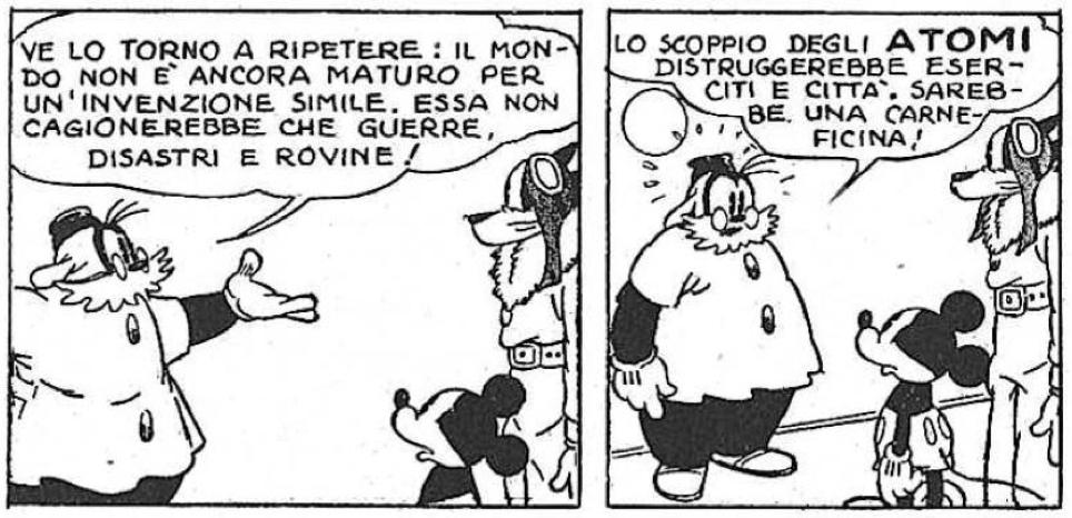 In America proprio ci stavano pensando da prima di quel 1945: già Walt Disney e Floyd Gottfredson davano voce al timore di un uso militare e distruttivo dell’ancora non del tutto scoperta fissione dell’atomo in Topolino e il misterioso uomo nuvola